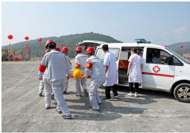 演練模擬在礦山現(xiàn)場1512平臺,由于雨后爆堆松軟,排險不及時,導(dǎo)致挖掘機進行挖裝作業(yè)時發(fā)生坍塌事故,土石坍塌砸到駕駛室,車門無法正常開啟,駕駛員被困駕駛室并且傷情不明,現(xiàn)場管理人員向應(yīng)急指揮部報告后,立即啟動應(yīng)急預(yù)案,組織人員開展傷員救助。 演練開始前兗州中材呂梁分公司項目經(jīng)理王建立發(fā)表講話,并介紹了項目情況。王經(jīng)理表示,呂梁分公司成立十年來一直秉承一個央企的責(zé)任,履行企業(yè)的安全管理職責(zé),展現(xiàn)國有大型企業(yè)的擔(dān)當(dāng)。安全工作從嚴(yán)要求,做好企業(yè)安全形象。提升服務(wù)高度、精度和寬度,為礦山行業(yè)的健康發(fā)展貢獻力量。